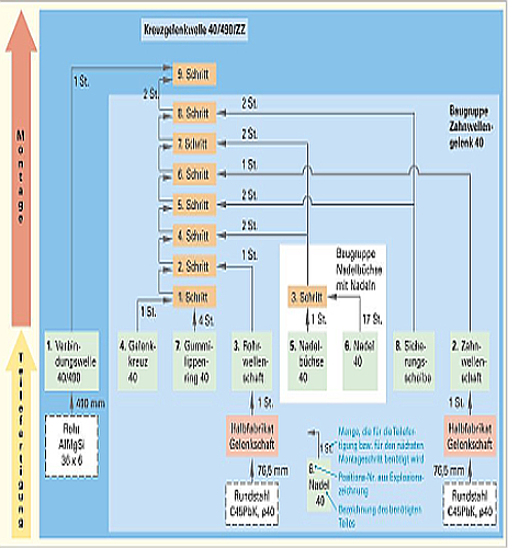 भागों विनिर्माण और विधानसभा के उत्पाद ट्री में तार्किक अनुक्रम के अनुसार सामग्री उत्पाद (भागों) की तैयारी के लिए आवश्यक के सभी सूचीबद्ध हैं। एक हिस्से का उत्पादन स्तर विनिर्माण पहलुओं के अनुसार भाग की आवश्यकता होती है।