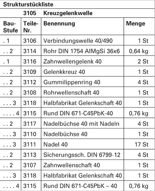 संरचना बीओएम में उत्पादन के स्तर के आधार पर संरचित संरचना में सभी भागों होते हैं। यह अपने informatonshalalt उत्पाद पेड़ में मेल खाती है। ढांचे को समाप्त भाग (निर्माण चरण) की विशिष्टता और बाह्यरेखा वर्णों, जैसे अंक या रिक्त स्थान के माध्यम से स्पष्टता के लिए प्रतिनिधित्व किया जाता है। प्रत्येक अभिभावक भाग संख्या के लिए, सीधे अधीनस्थ भाग संख्या को तुरंत बाद में निर्दिष्ट किया जाना चाहिए। मात्रा सीधे बेहतर भाग संख्या के माप की एक इकाई को दर्शाती है।